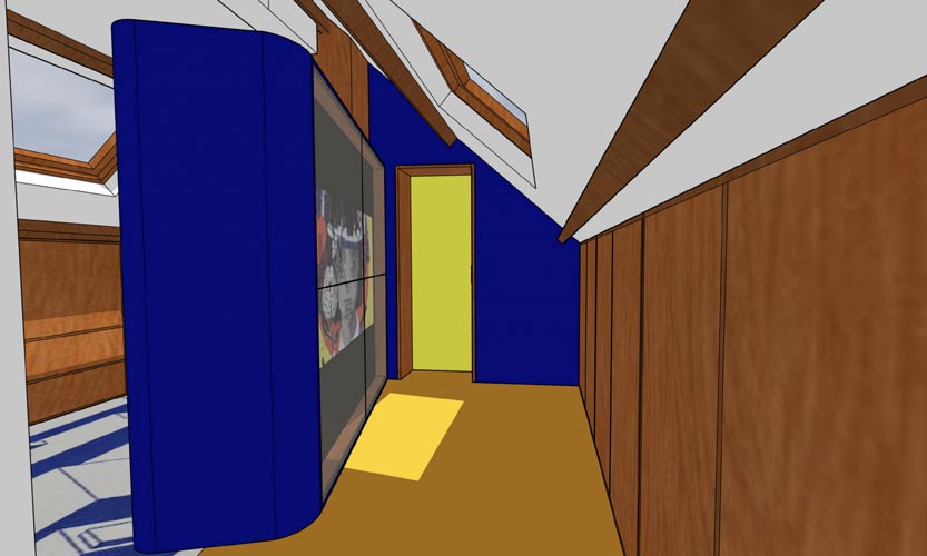 Een dressing op maat die zolderruimte transformeert tot praktische opbergruimte. De combinatie van Amazakoué hout en grenen multiplex zorgt voor visuele warmte, terwijl spiegels op maat zowel functionaliteit als ruimtegevoel vergroten. Het handgeknoopt tapijt voegt comfort toe onder de voeten en zorgt voor geluidsdemping. Elk element is doordacht geïntegreerd om dagelijkse aankleedroutines georganiseerder en aangenamer te maken.